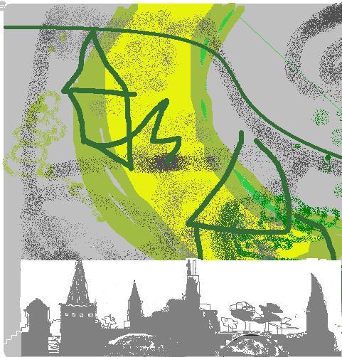Darüber der bunte, wirre Teil des Traums mit grünen Wiesen und Feldern